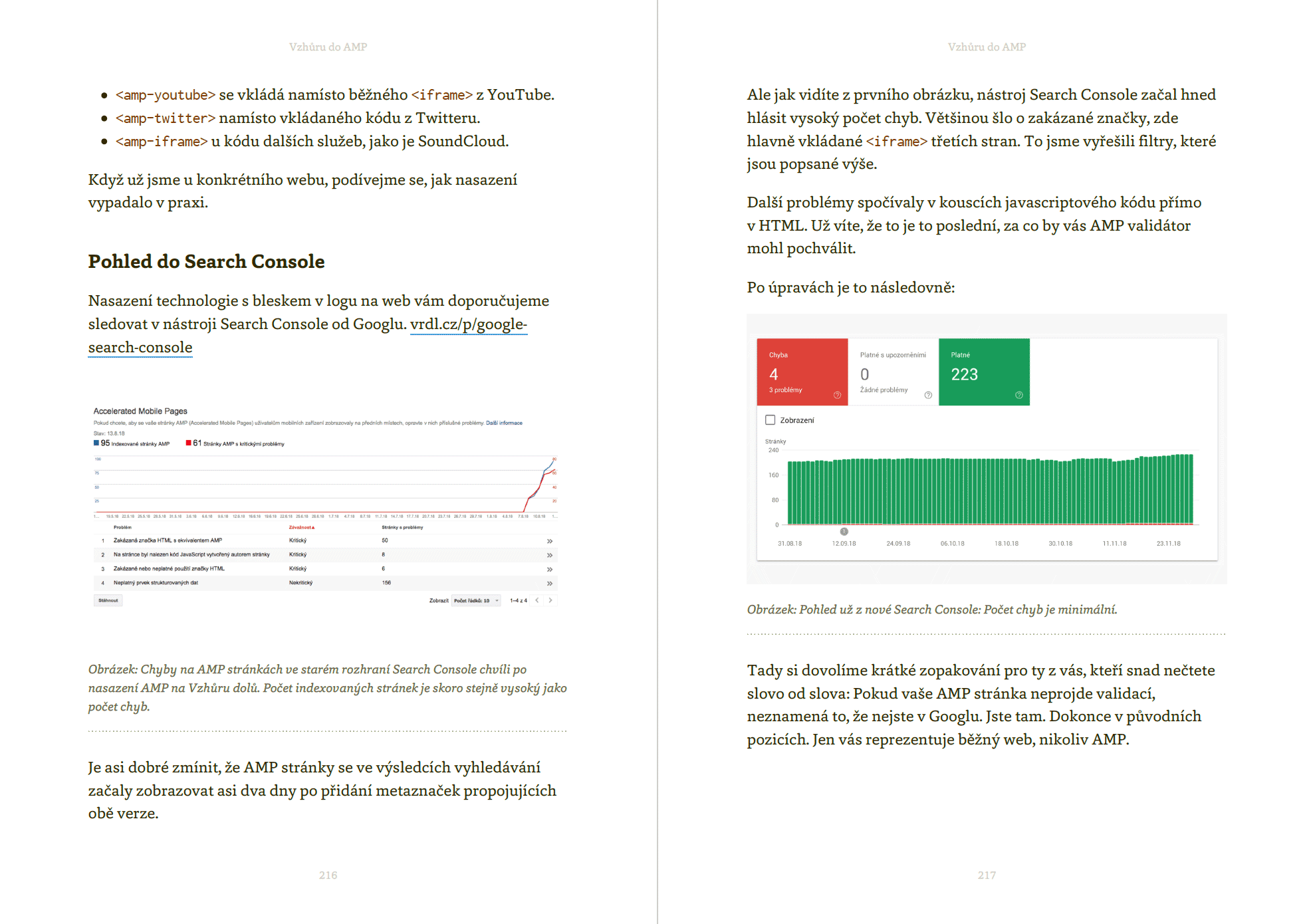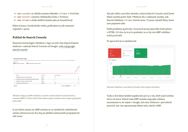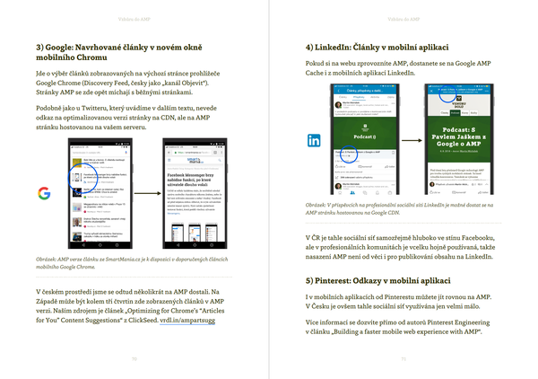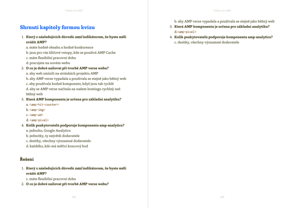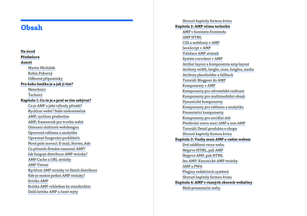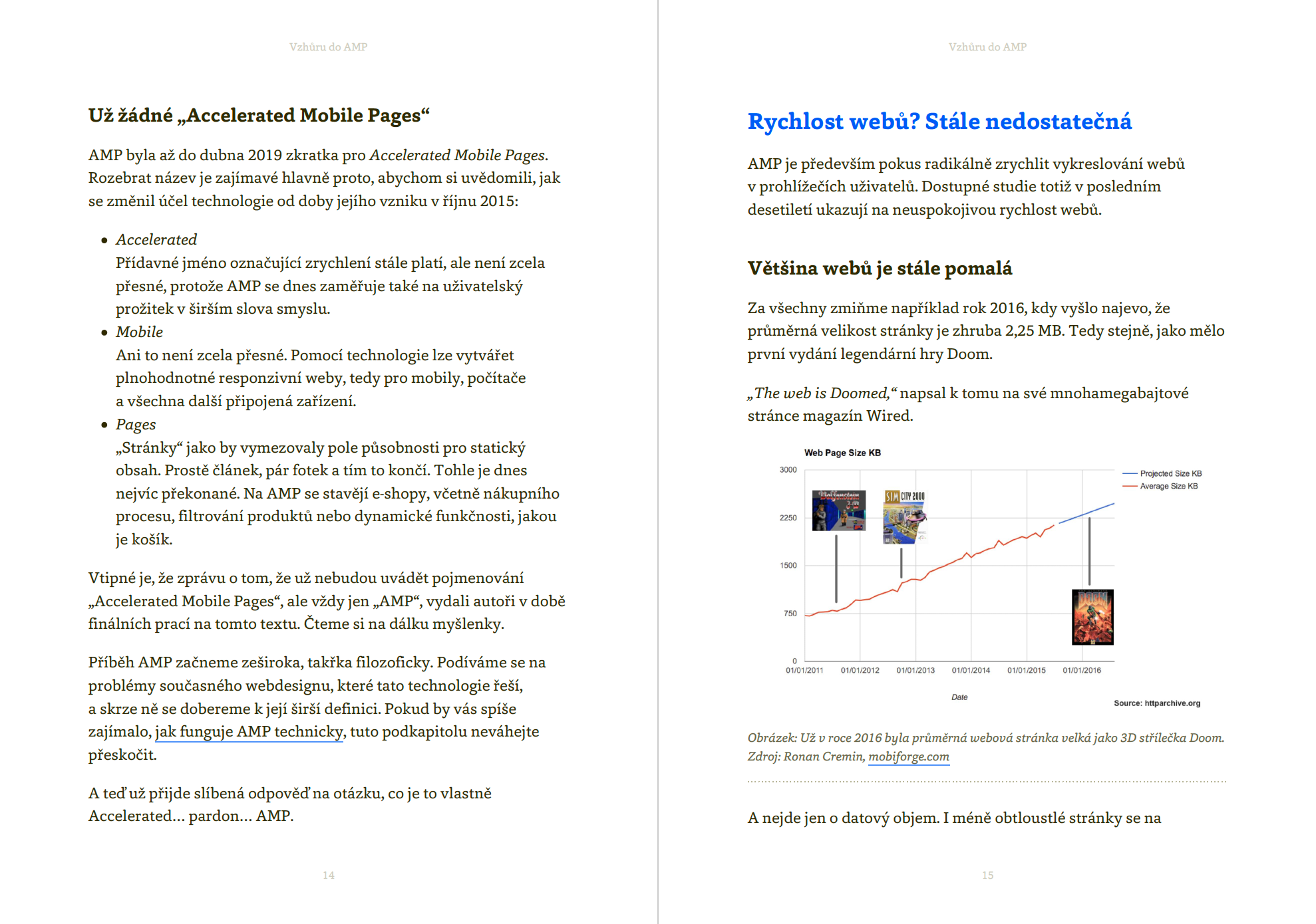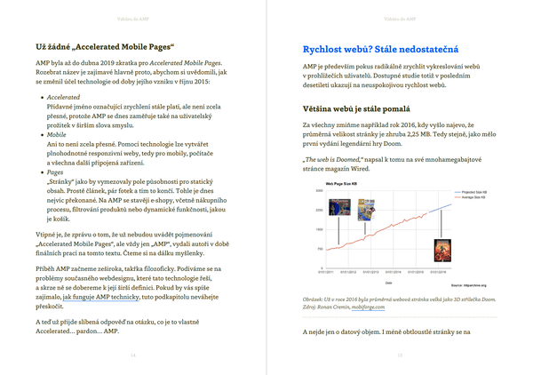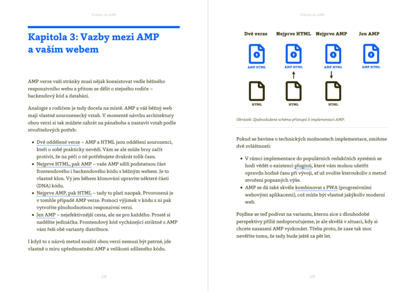 Vysvětlení motivace za AMP, detailní rozebrání fungování této technologie. První kapitola je pro techniky i netechniky: Co je AMP a jaké výhody přináší – Rychlost webů je nedostatečná – AMP je rychlost – AMP jako framework pro tvorbu webů – AMP omezuje složitost webdesignu – Opravená reklama a analytika – Upravené fungování prohlížečů – Co firmám přineslo nasazení AMP – AMP Cache a URL stránky – AMP Viewer – Rychlost AMP stránky v různých fázích distribuce – Kde je možné potkat AMP – Kritika AMP – AMP a standardy – Časté mýty spojené s AMP