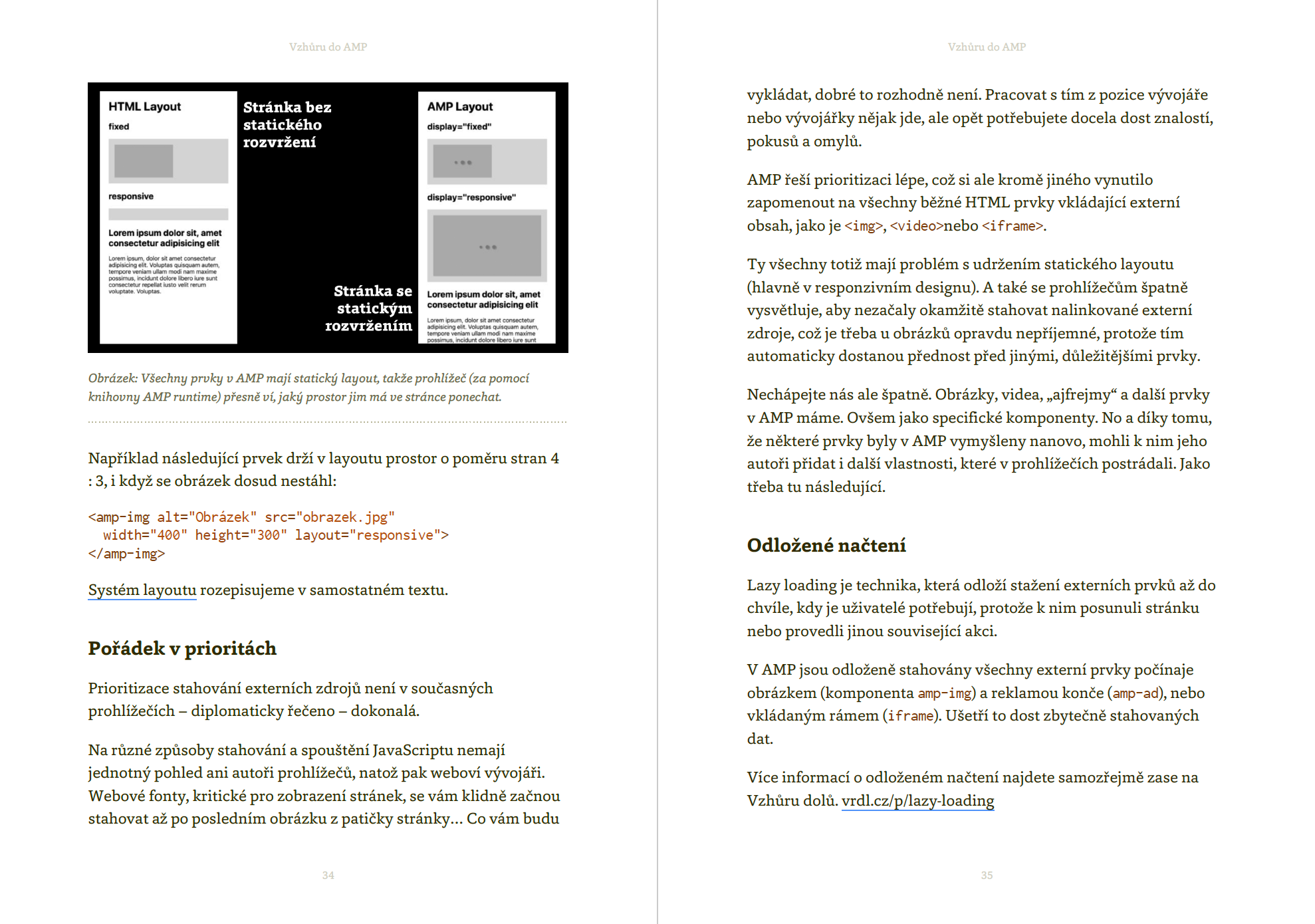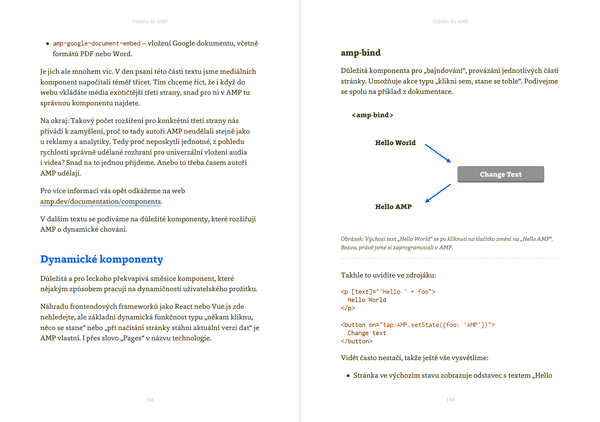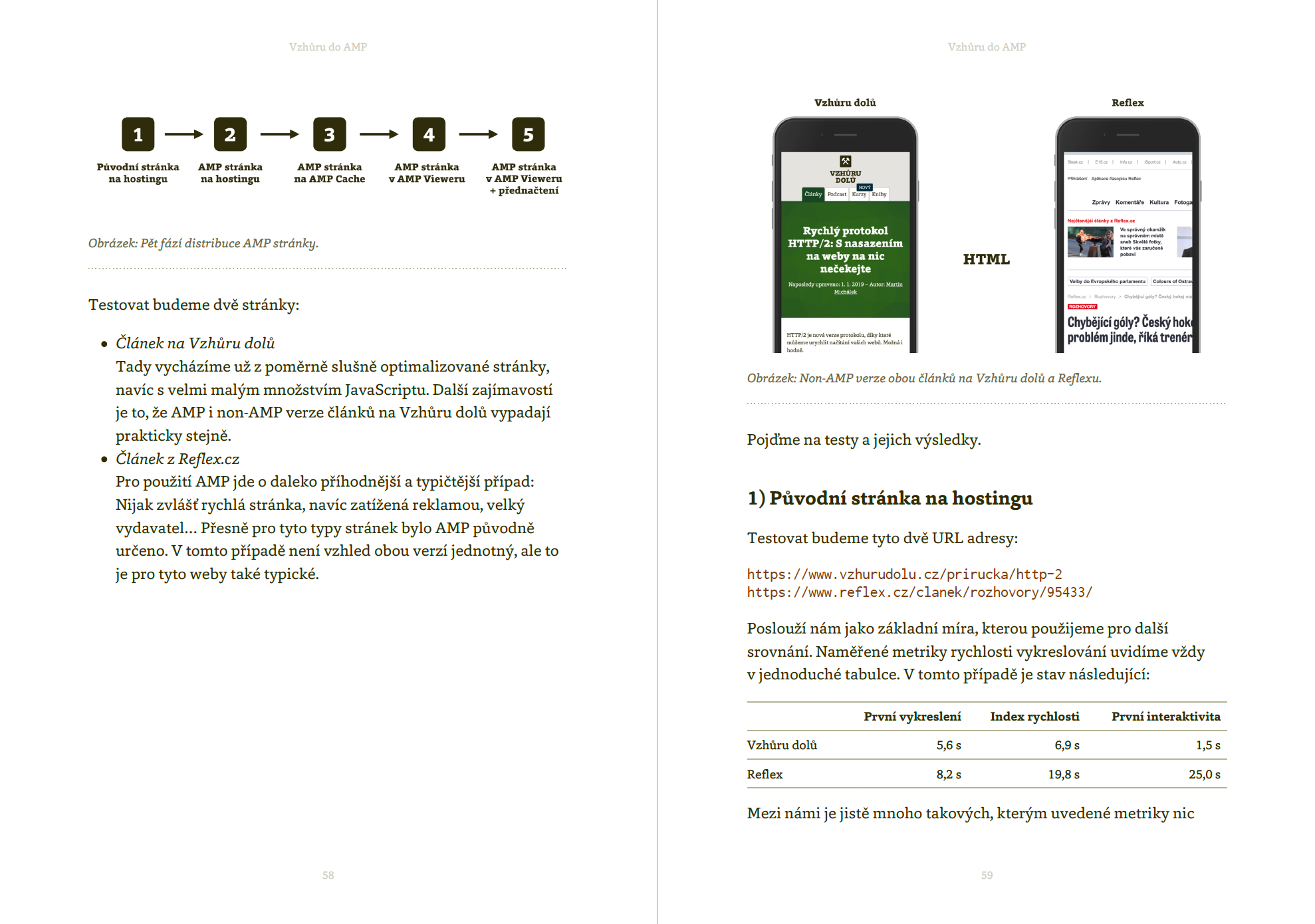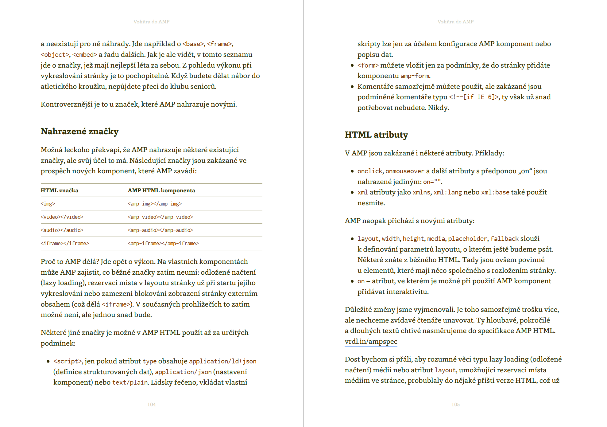 Vysvětlení motivace za AMP, detailní rozebrání fungování této technologie. První kapitola je pro techniky i netechniky: Co je AMP a jaké výhody přináší – Rychlost webů je nedostatečná – AMP je rychlost – AMP jako framework pro tvorbu webů – AMP omezuje složitost webdesignu – Opravená reklama a analytika – Upravené fungování prohlížečů – Co firmám přineslo nasazení AMP – AMP Cache a URL stránky – AMP Viewer – Rychlost AMP stránky v různých fázích distribuce – Kde je možné potkat AMP – Kritika AMP – AMP a standardy – Časté mýty spojené s AMP