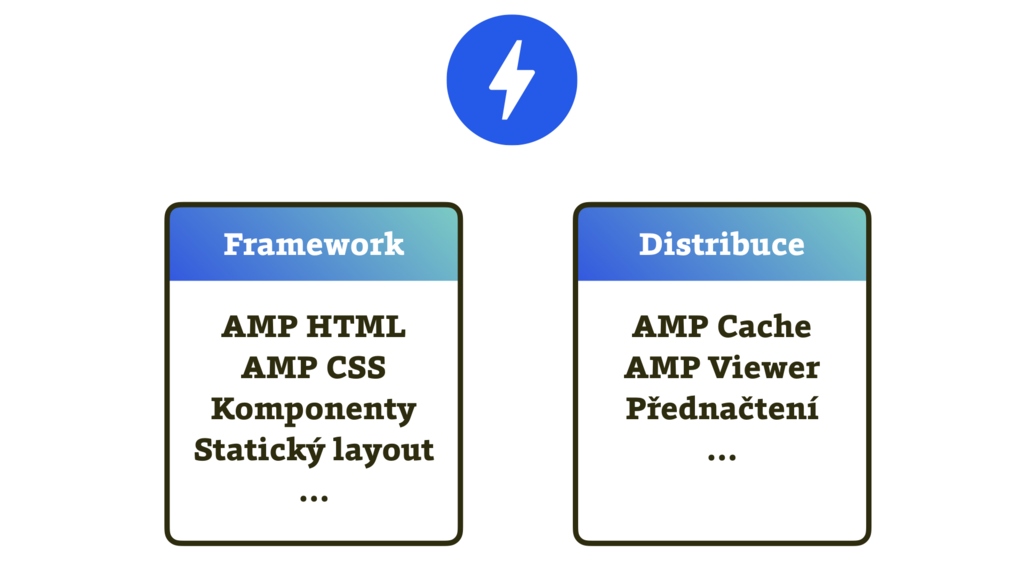 AMP jsou dvě věci. Frontendový framework a distribuce, která se vyhýbá pomalé síti a pomalým serverům. Rozmísťuje stránky po optimalizovaných serverech (CDN).
