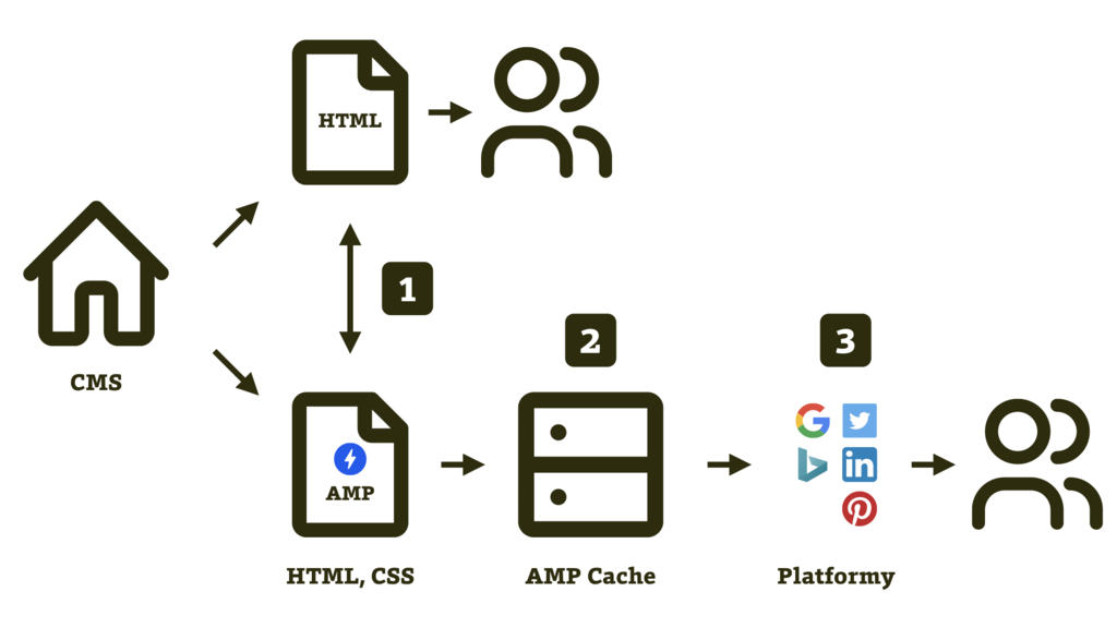 Roboti se o AMP stránce dozví prostřednictvím odkazu v HTML stránce (1), pak ji umístí na celosvětovou síť optimalizovaných serverů AMP Cache (2), kde je k dispozici platformám, které AMP dokáží využít (3).