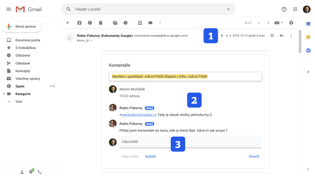 Naše první setkání s AMP e-mailem. Zpráva od Dokumentů Google během práce na knížce… Hádejte o čem? 1) Označení dynamického e-mailu. 2) Komentáře se průběžně aktualizují. 3) Přímo z e-mailu je také možné odpovědět.