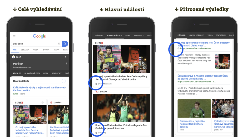 Výsledky vyhledávání Googlu. Zvýšený výskyt AMP je možné sledovat hlavně v místech, která se týkají aktuálních událostí.