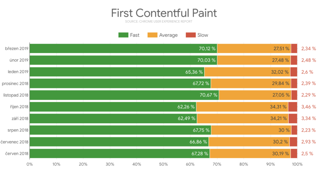 První vykreslení obsahu je u skutečných uživatelů na Vzhůru dolů slušné. Google by si mohl začít myslet, že jde o rychlý web. Co když tu rychlost ale z minuty na minutu pokazíme? Zdroj: Chrome UX Report Dashboard.