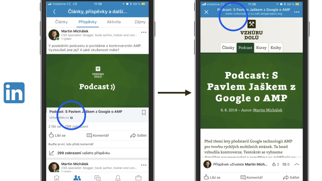 V příspěvcích na profesionální sociální síti LinkedIn je možné dostat se na AMP stránku hostovanou na Google CDN.