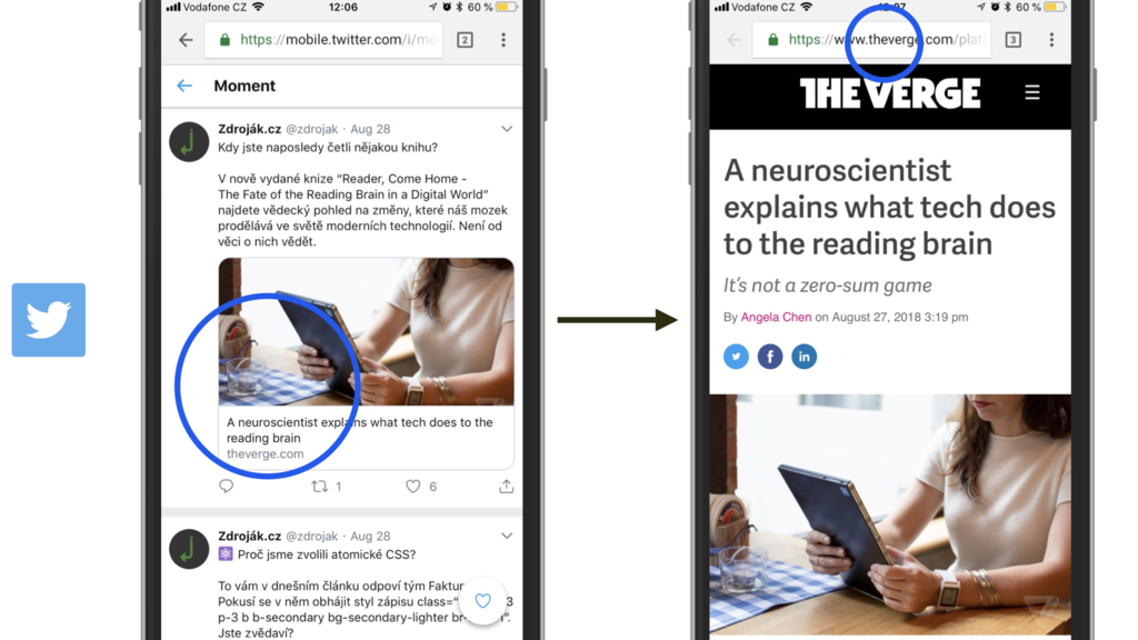 Odkaz na AMP verzi článku z The Verge v Twitter Moments.