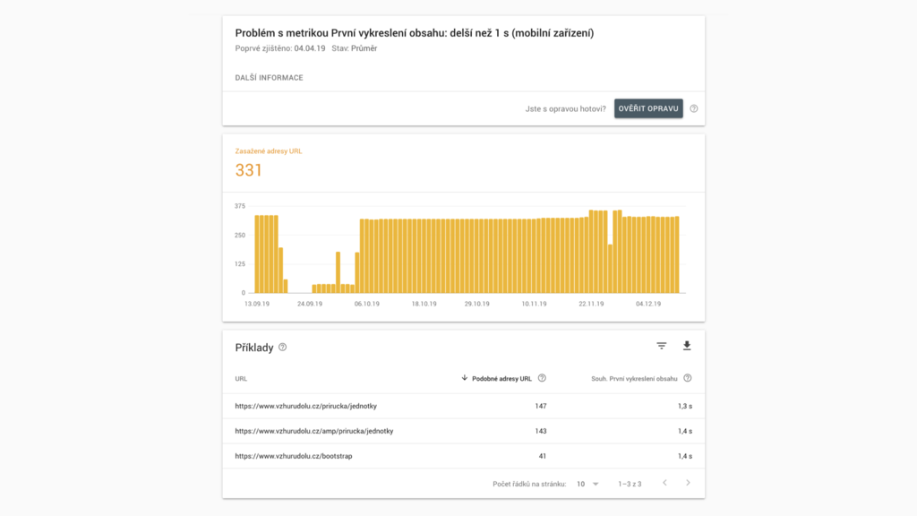 3. V reportu se proklikáte až na seznam pomalých nebo průměrných URL adres webu (např. „Otevřít přehled“ > „Pomalu“ > „Podrobnosti“).