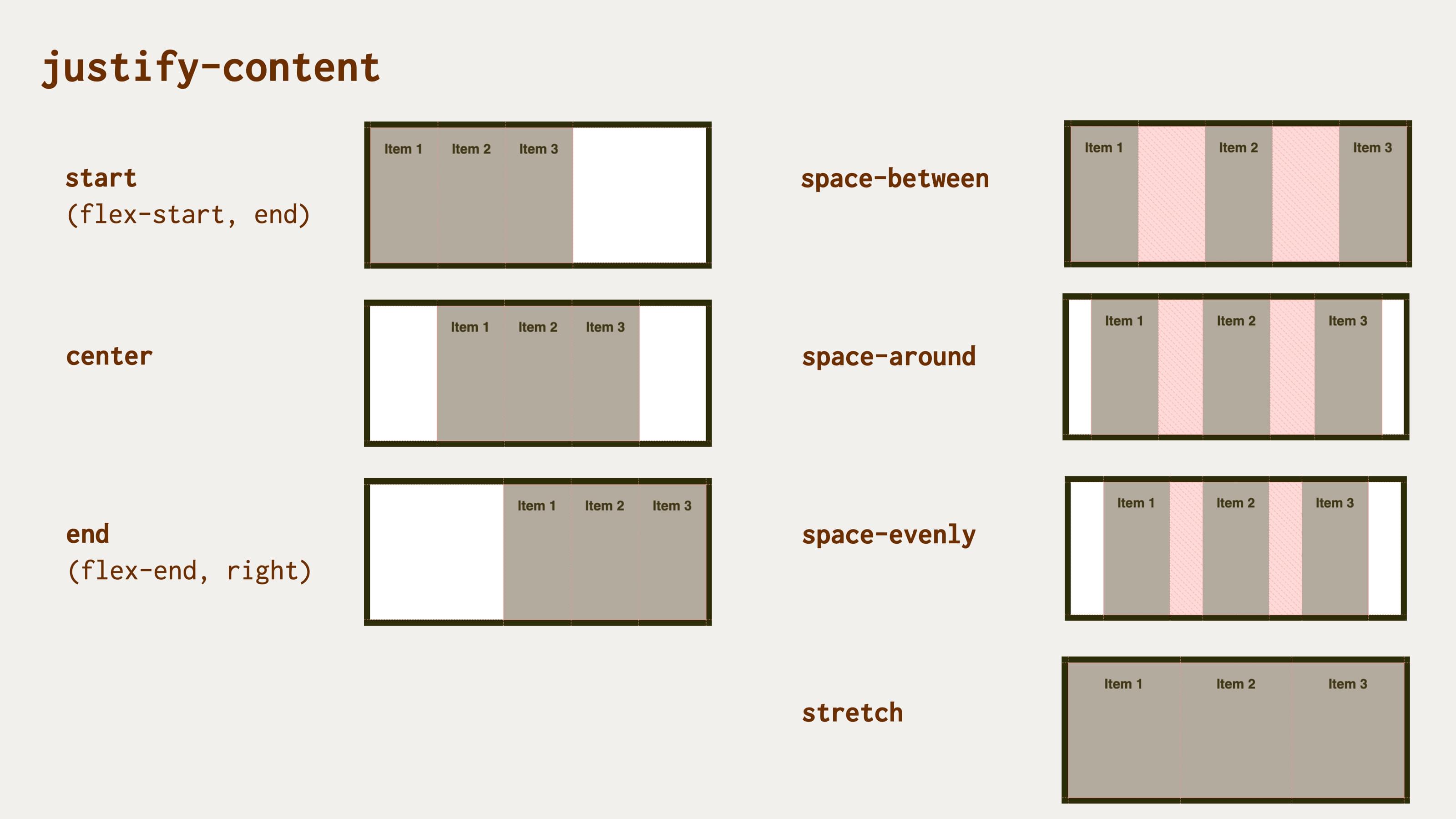 definuje, jak prohlížeč distribuuje prostor mezi položkami obsahu podél hlavní (nebo řádkové) osy kontejneru layoutu.