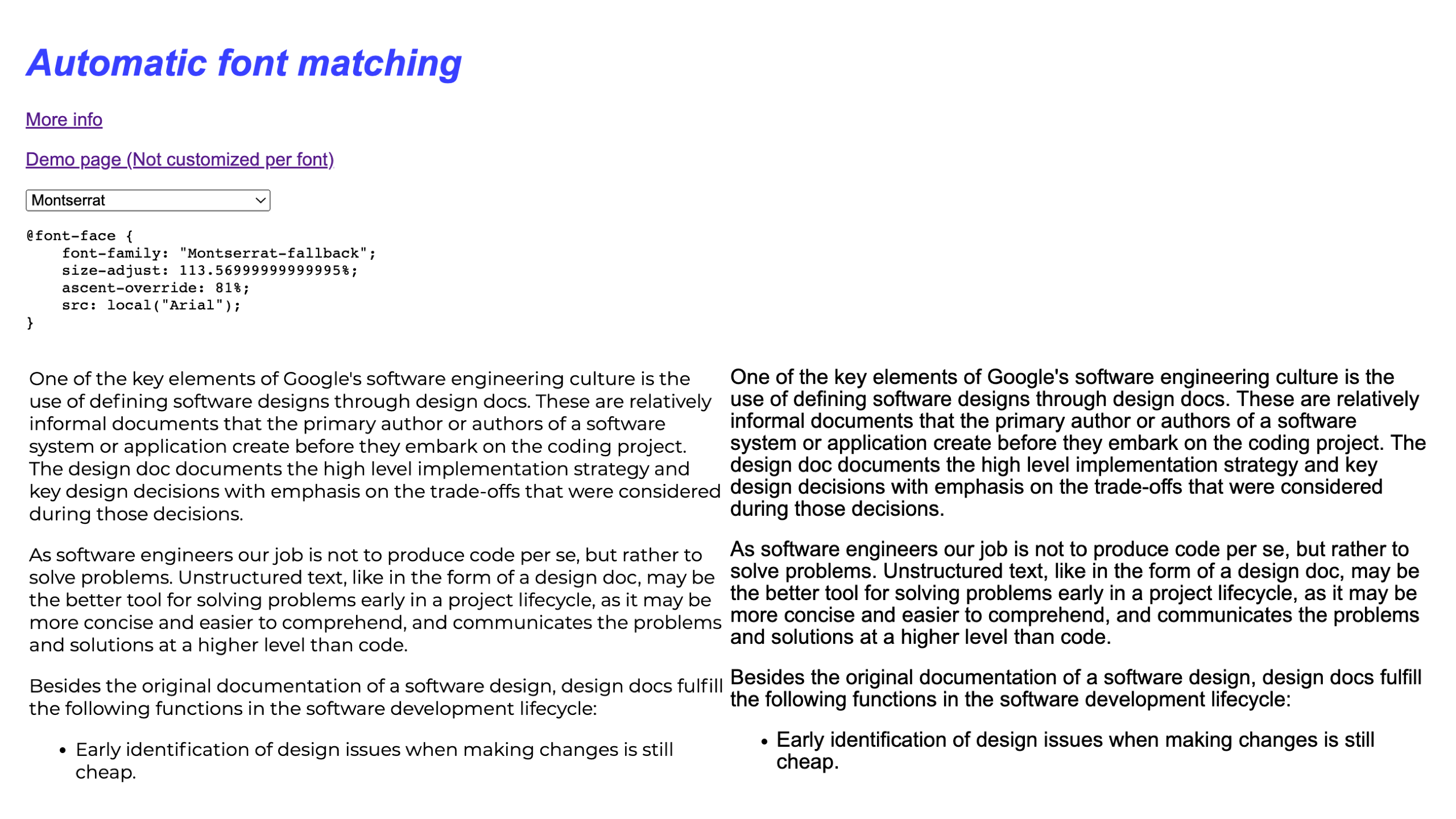 Pro pořádek ještě dodávám už dlouho existující nástroj Font style matcher, který dělá podobnou věc - snaží se sjednotit styl systémového písma se stylem webfontu. Problém zde ale je v tom, že styly se, na rozdíl od deskriptorů jako je size-adjust