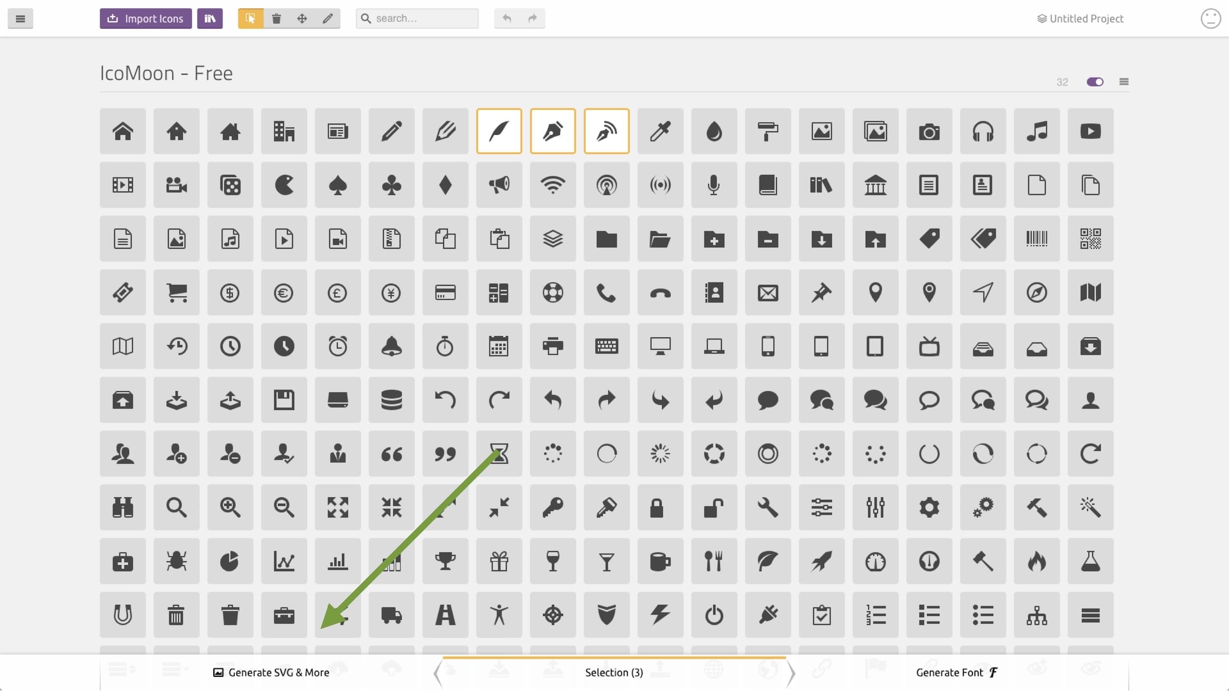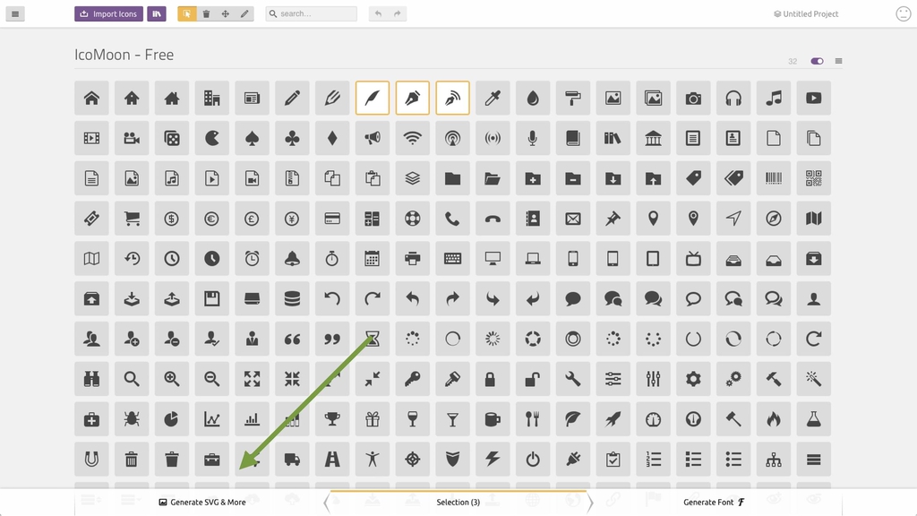 • IcoMoon – Viz obrázek. V balíčku jsou opět SVG sprajty, spolu s jednotlivými SVG.
