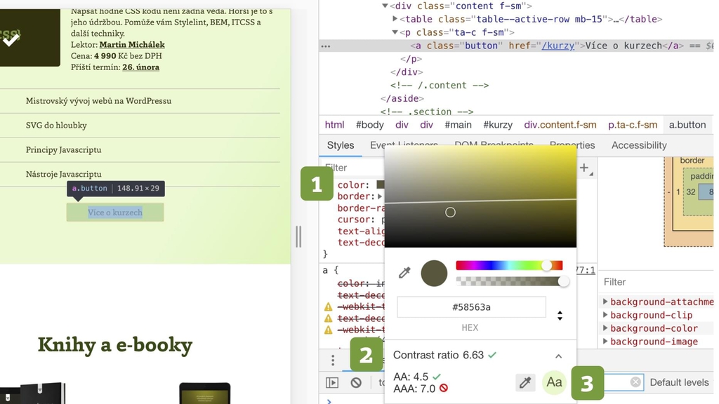 Chrome DevTools: Kliknutím na jakoukoliv barvu (1) se vám rovnou může zobrazit barevný kontrast (2). Jen je občas potřeba ručně doplnit barvu pozadí (3)