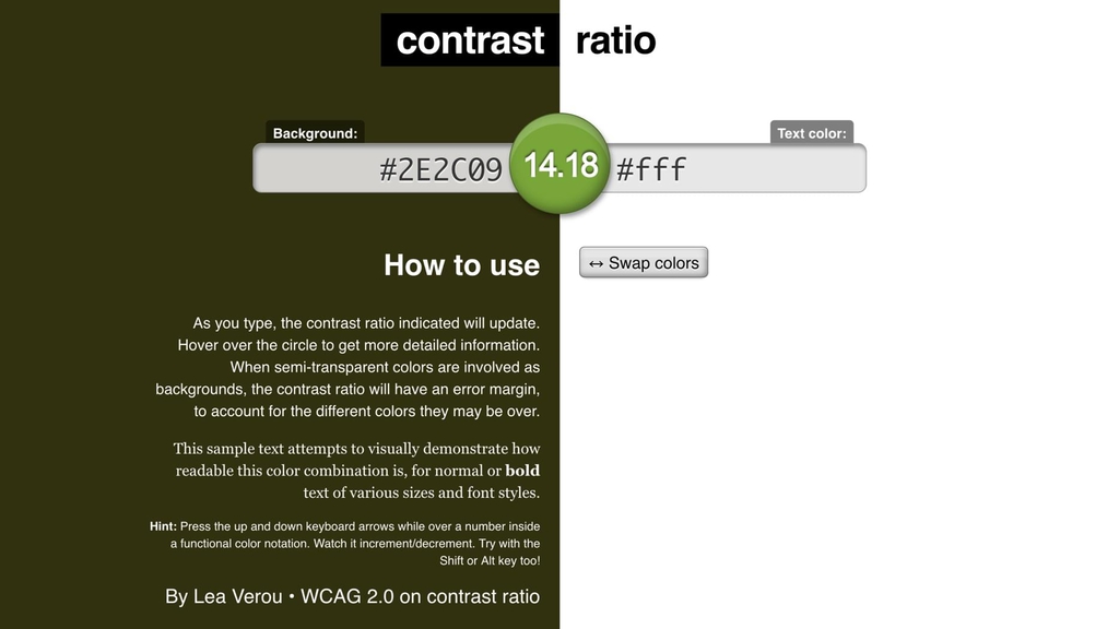Fakt jednoduchý (ale o to užitečnější!) nástroj, kam prostě vložíte dvě barvy a v zeleném poli uvidíte jejich vzájemný kontrastní poměr. contrast-ratio.com