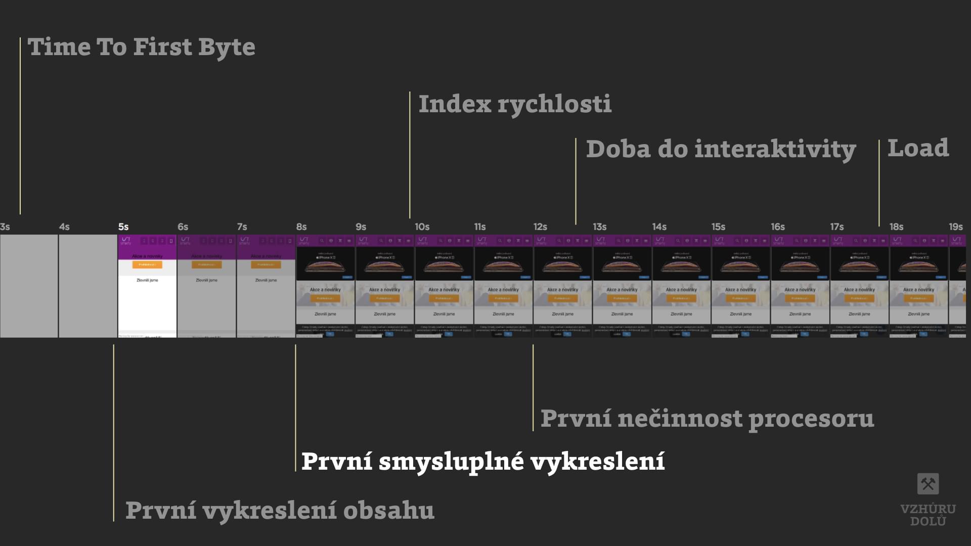 Na časové ose je velmi blízko metrikám FP (První vykreslení), FCP (První vykreslení obsahu) a DCL (DOM Content Loaded).