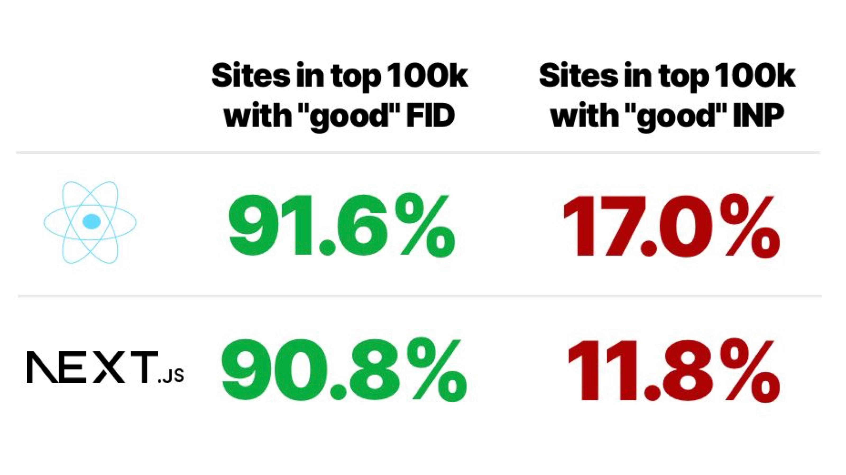 INP je totiž daleko přísnější. Například Tim Kadlec změřil, že z webů postavených na Reactu vyhovuje této metrice jen 17 %. Weby postavené na Next.js jsou na 12 % úspěšnosti.