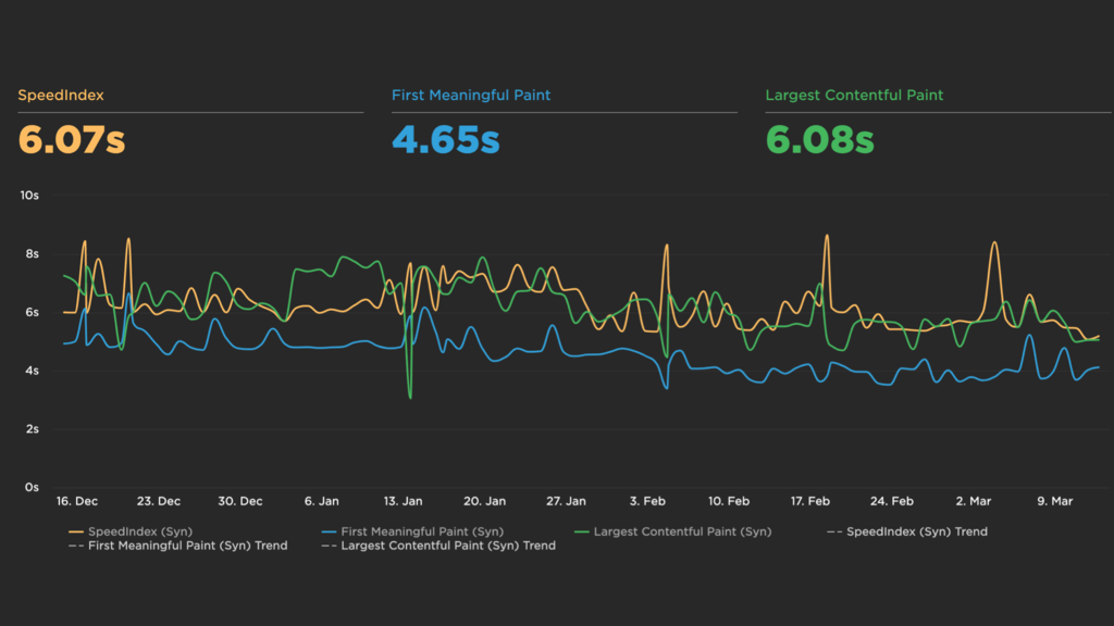 Index rychlosti ukazuje, jak rychle je viditelný obsah stránky naplněn do stavu stoprocentního vykreslení. SI ale reflektuje vykreslení viditelného viewportu, nikoliv hlavního obsahu. Často je navíc Speed Index zkreslený komponentami třetí strany zobrazujícími cookie lištu nebo okno s chatem. SI je ještě k tomu obtížné ukládat do RUM dat, protože potřebujete záznam průběhu vykreslování.