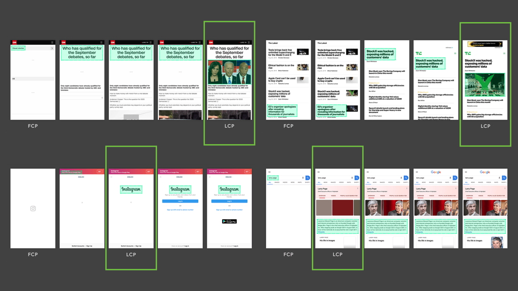 Obrázek: A máme tě! Jak vidíte, LCP poměrně chytře odhalí obsahově nejpodstatnější část stránky. Zde je ilustrace na různých typech webů. Zdroj: web.dev.