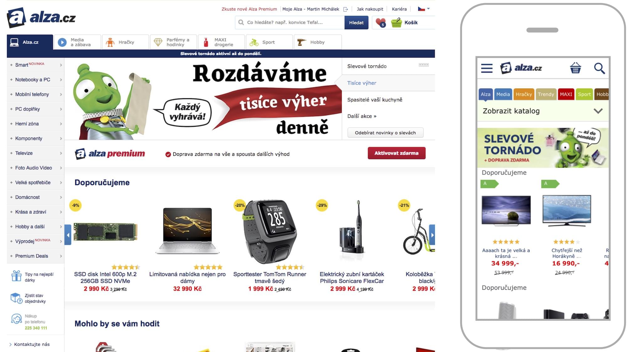 Příkladů řešení „Desktop First“ najdeme v Česku hodně. Vezměme Alzu, která má v době mého psaní dva oddělené weby pro malé a pro velké displeje. Webařský tým Alzy odvádí skvělou práci – stačí se podívat na jejich pozici na trhu. Nesou si s sebou ale zátěž desktopového webu. Ten už dnes plně nereflektuje rozšíření mobilních zařízení mezi uživateli.
