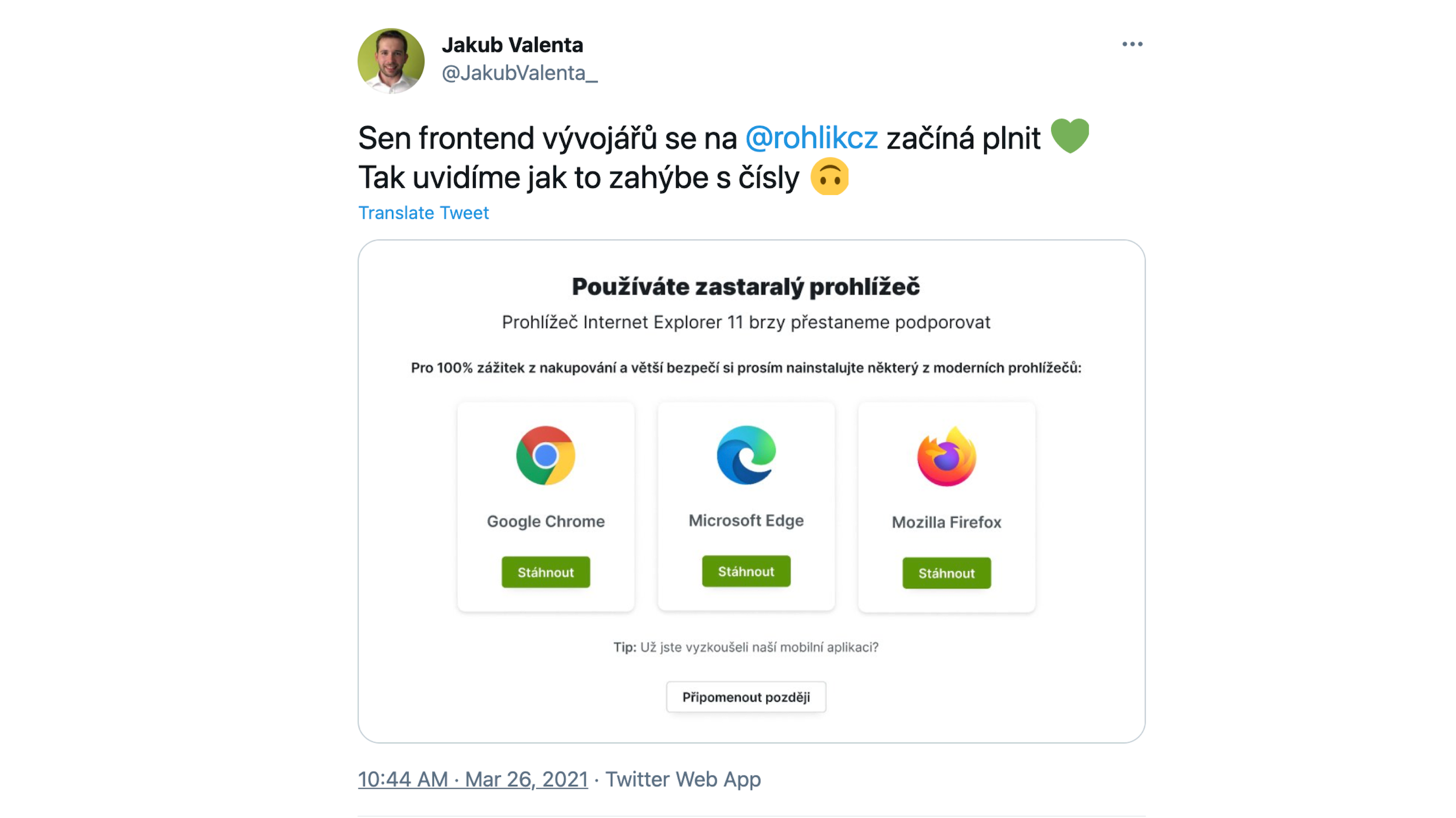 Takto to pojali například vývojářky a vývojáři v Rohlík.cz. Podíl IE je na Rohlíku nízký, jenže přepočteno na tržby se to pořád vyplatí.