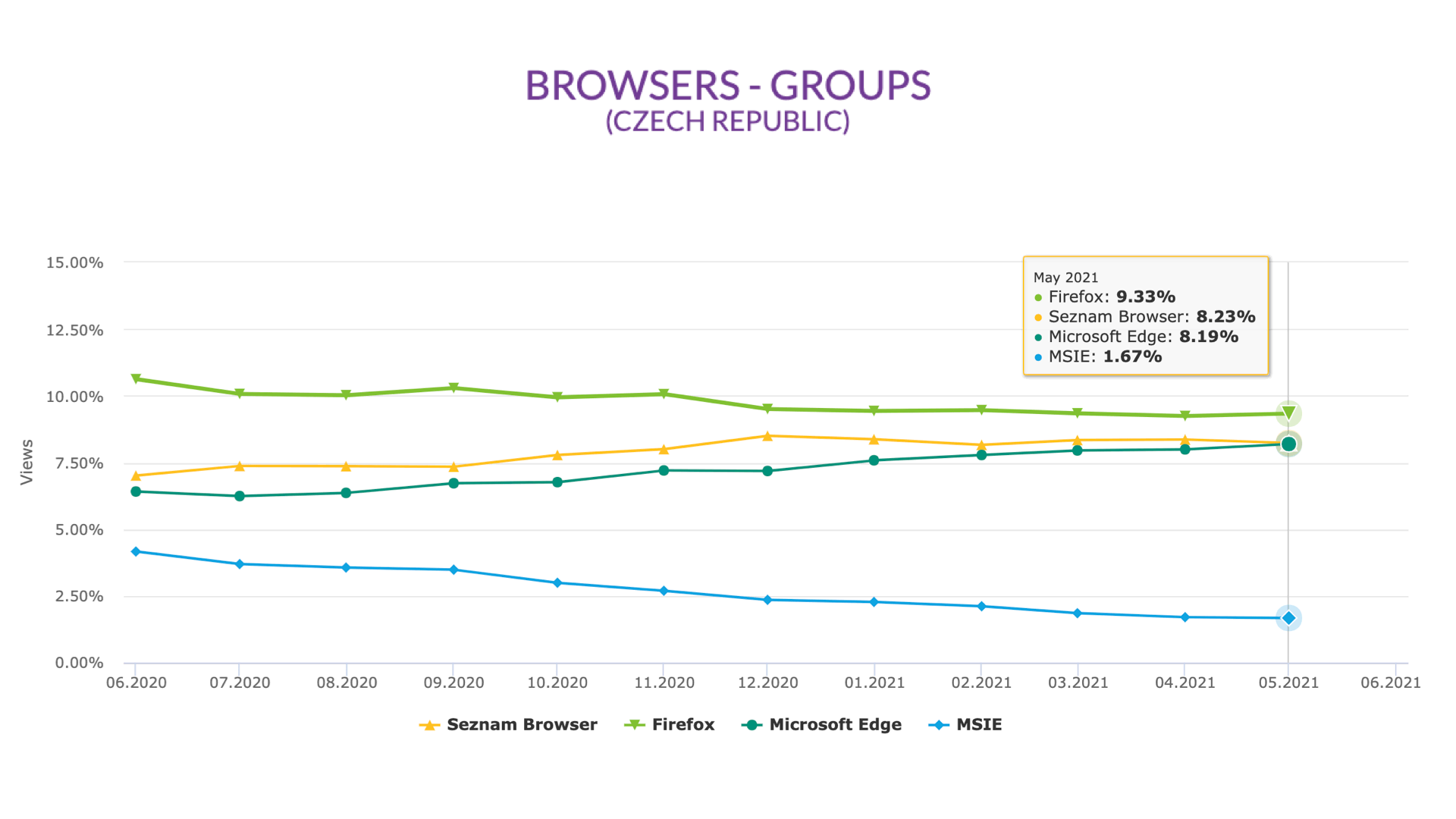 Aktuální podíl MSIE mezi uživateli je v ČR mezi 1-2 %. A klesá to
