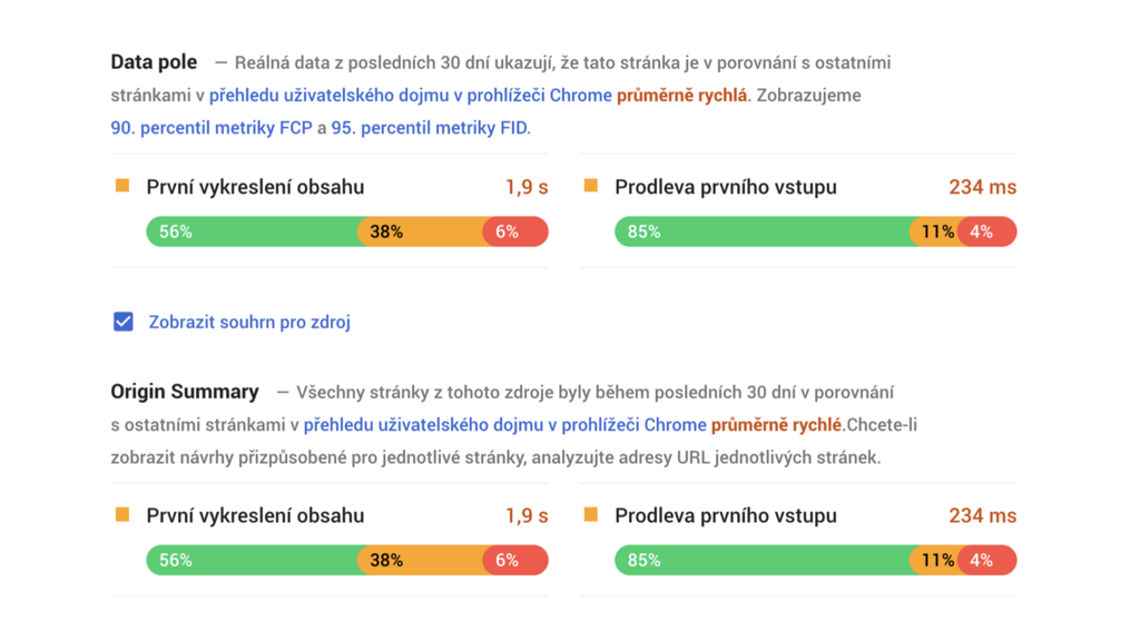 Jde o metriky od skutečných uživatelů vašeho webu. Alespoň těch, kteří používají Google Chrome. Zdrojová databáze se jmenuje Chrome UX Report, pokud by vás to zajímalo. A mělo by zajímat.