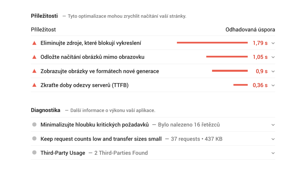 Nástroj vám také rovnou nahlásí největší příležitosti, které na stránce našel a jejichž odstranění vám vylepší hodnocení a ve výsledku samozřejmě zrychlí web. K tomu se ještě dostaneme.