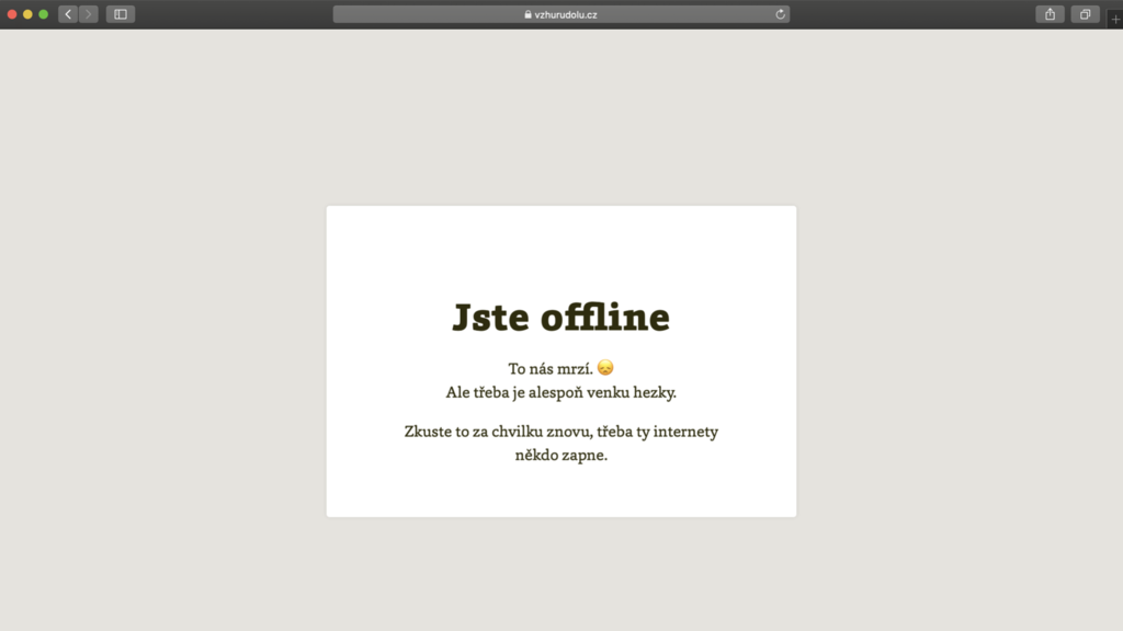 Další z požadavků Lighthouse pro správné základní PWA je „offline stránka“ informující uživatele, že nemá připojení k internetu.