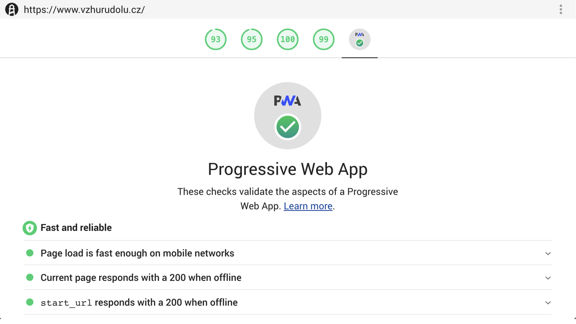 To je vše. V tuhle chvíli jsme z obyčejného webu vytvořili progresivní webovou aplikaci, splňující požadavky Lighthouse. Jednoduchou, ale naši PWA.