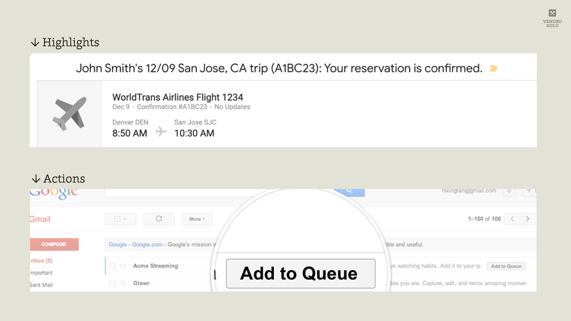 Obrázek: Zvýraznění (Highlights) a rychlé akce (Actions) v Gmailu. I tohle dokážou zařídit strukturovaná data.