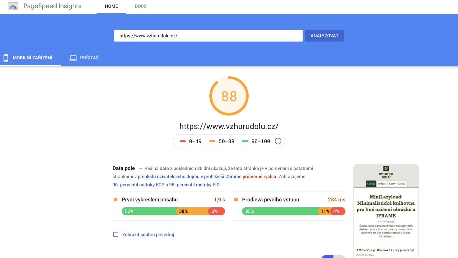 Google PageSpeed Insights zobrazí skóre webu, ale také rovnou návrhy na vylepšení