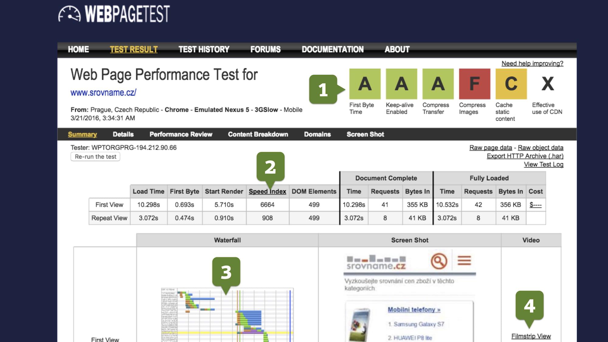 WebpageTest.org: kromě vysvědčení (1) vidíme i Speed Index (2), vodopádový pohled (3) nebo se můžeme prokliknout na filmový pás (4)