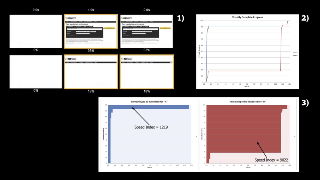 1) Vezměme jeden web se dvěmi různými postupy vykreslování. 2) Do grafu si vykreslíme postup vykreslování obou případů. Ve vodorovné ose je čas, ve svislé procenta vykreslení viditelné části obrazovky. 3) Speed Index je plocha nad průběhem grafu. (Zdroj obrázku: WebpageTest.org)